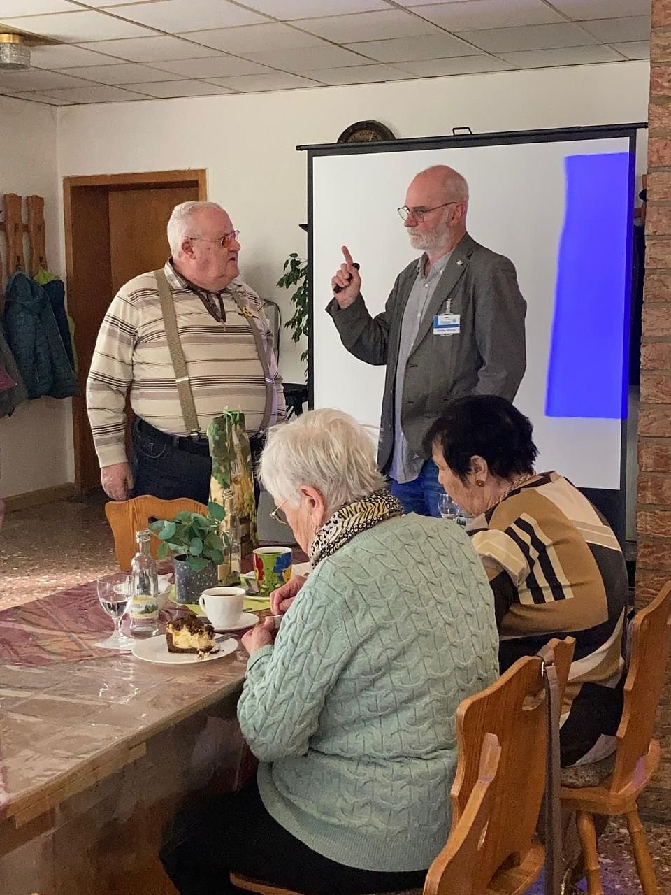 So seien nur einige Beispiele und Aspekte stellvertretend der breiten Palette hier genannt. Etliche dieser Maschen erklärte Herr Ritschel sehr anschaulich im Dialog mit uns, was es noch anschaulicher und einprägsamer für uns macht. Wie schnell doch die Zeit bei so einem interessanten, aber leider doch öfters negativem Hintergrund vergeht, da ja tagtäglich Menschen auf solche Maschen hineinfallen? Wir bedanken uns recht herzlich bei Herrn Ritschel für diesen sehr interessanten Nachmittag in unserer Gruppe. Herr Haubner vom Handwerkerstübchen hatte zum Kaffee neben herzhaften Gerichten auch extra für uns einen besonderen knusprigen Pfirsich-Streusel-Käsekuchen gebacken, der hervorragend schmeckte.