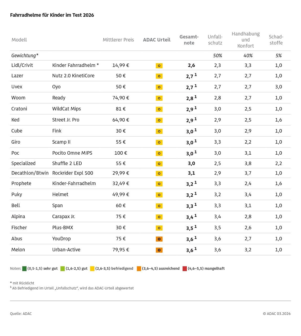 Die erfreuliche Nachricht ist zunächst, dass jeder der 18 Helme bei einem Unfall vor schweren Kopfverletzungen schützt. Am besten gelingt das dem günstigsten Produkt im Test: Der Helm von Crivit kostet nur knapp 15 Euro, erreicht im Test neben nur einem weiteren Modell eine gute Bewertung beim Unfallschutz und wird zugleich Testsieger über alle Kategorien (Gesamtnote 2,6). Der Helm, der für Lidl produziert wird, besticht vor allem in Sachen Sichtbarkeit. Er hat gut sichtbare Reflexionsstreifen und zudem ein verbautes Rücklicht, bei dem die Batterien mit wenig Aufwand selbst gewechselt werden können. Schwächen zeigt er dafür beim Tragekomfort, der nur mit ausreichend bewertet wurde.