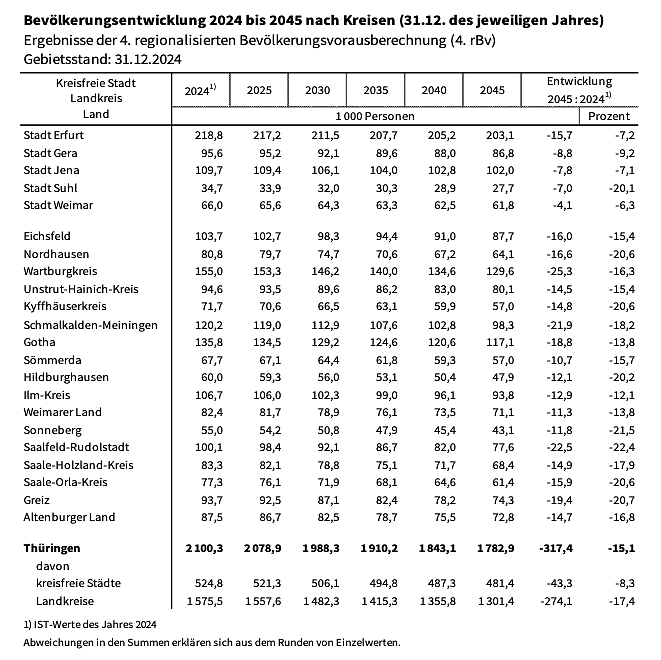 Nach den Ergebnissen wird sich die Thüringer Bevölkerung in den nächsten 21 Jahren weiter reduzieren. Lebten Ende 2024 rund 2.100,3 Tausend Personen in Thüringen, wird der Freistaat im Jahr 2045 voraussichtlich noch 1.782,9 Tausend Einwohnerinnen und Einwohner haben. Dies entspricht einem Rückgang um 15,1 Prozent bzw. 317,4 Tausend Personen.