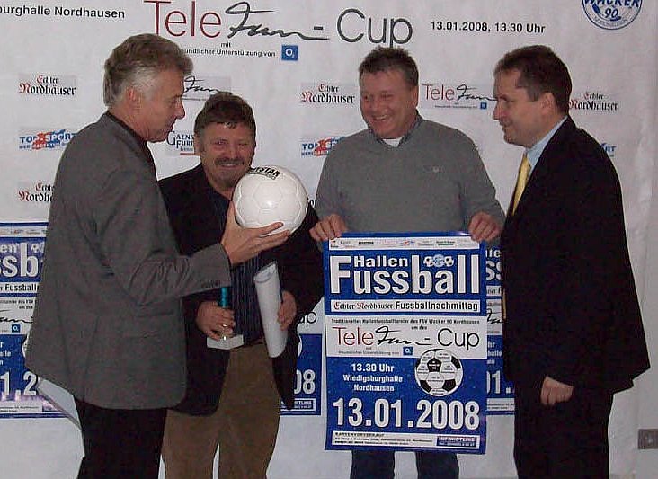 Autor: oschEin Jubiläum kann gefeiert werden, denn schon zum zehnten Male lädt Nordhausens Fußballsportverein Wacker 90 zum Budenzauber in die Wiedigsburghalle. Und wieder freuen wir uns auf eine Neuerung. Sieben Teams werden am Sonntag, 13. Januar die Jagd nach dem TeleFun-Cup 2008 aufnehmen. Darüber unterrichtete heute Vormittag der Geschäftsführer der veranstaltenden Top-Sport-Werbeagentur, Uli Mappes in der Traditionsbrennerei in der Grimmelallee. Hierhin hatte Wackers Hauptsponsor Nordbrand Nordhausen zur Pressekonferenz geladen.