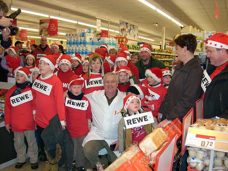Als gar noch jeder einen Weihnachtskalender erhielt, war der Andrang groß. Wieder aus dem Markt heraus wurden die Muster der 500 Euro wie Trophäen in die Höhe gereckt und anschließend in Fußballermanier zum Gruppenfoto angetreten.