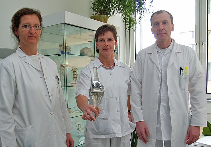 Fachärztin für Orthopädie, Dr. med. Christine Knauer, mit Modell eines Kniegelenks, rechts daneben der Chef des Zentrums für Rehabilitation und Physiotherapie, Dr. Andreas Wagner, links Oberärztin in der Klinik für Unfallchirurgie und Orthopädische Chirurgie, Dr. med. Wiltrud Schröder