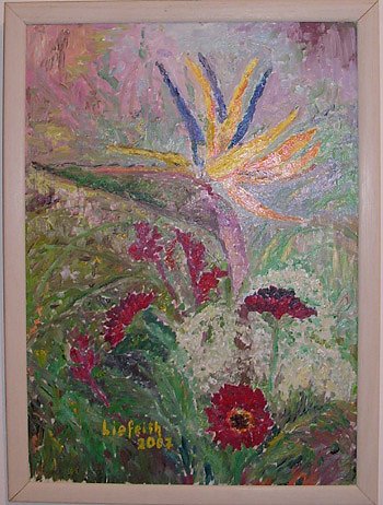 Und wenn es heißt neuste Bilder, dann im wahrsten Sinne des Wortes, denn das nebenstehende Bild aus dem Jahre 2007 fast noch feucht von der Farbe. Auch wenn Bürgermeister Joachim Kreyer (CDU) in seinen Begrüßungsworten nicht über das Alter sprechen wollte, ihre alte Freundin Frau Ballhause hat es indirekt verraten. Die vielseitige Künstlerin wurde 1923 geboren und ist immer noch aktiv tätig, nicht nur beim Malen. Die Künstlerin ließ es sich nicht nehmen, bei jedem Bild etwas zu seiner Entstehungsgeschichte zu sagen. Neben interessanten Portraits von Kind und Enkel stelle sie viele Landschaftsbilder und Stilleben aus. Die Künstlerin sagte selbst: Was ich sehe, das male ich. Aber nicht nur Malen ist ihre Stärke. Sie schreibt auch Gedichte und fand in Bürgermeister Joachim Kreyer auch den richtigen Interpreten beim Vortragen.
