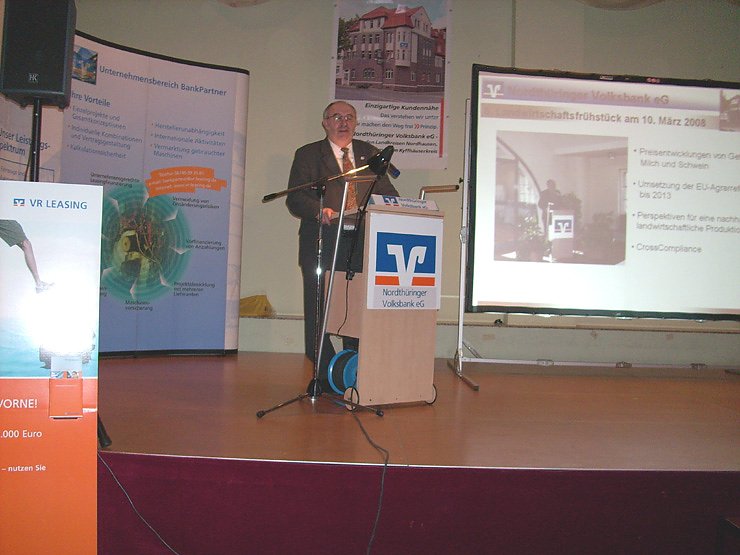 Vorstandsmitglied Harald Habermann (Bild rechts) von der veranstaltenden Nordthüringer Volksbank zog in seiner Begrüßungsrede eine positive Bilanz über die Arbeit des vergangenen Jahres. Es wurde ein gutes Betriebsergebnis erreicht und Habermann konnte feststellen, dass die Nordthüringer Volksbank gesund und gut aufgestellt ist. Diese Geschäftsstabilität wurde erreicht, weil man auf die Anlage von Großkunden verzichtet hatte, auch wenn dadurch etwas Bilanzsumme verringert wurde. Die Einlagen der Privatkunden stiegen aber um 2%. Durch diese solide Geschäftspolitik sei man nicht ins Schlingern gekommen, wie manchen Großbanken mit ihren Risikokrediten.