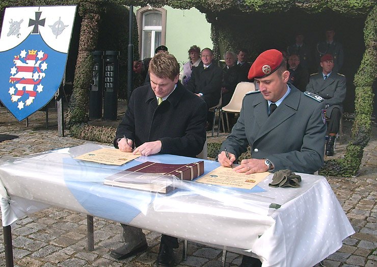 Bevor es zum feierlichen Gelöbnisses kam, wurde auch ein Patenschaftsvertrag zwischen der Stadt Bad Frankenhausen und dem Logistikbataillon 131 abgeschlossen, den auch nicht der am Tisch wehende ungestüme Wind verhindern konnte. Bürgermeister Matthias Strejc und der Kommandeur des Logistikbataillons 131 Oberstleutnant André Denk setzten die entsprechenden Unterschriften.