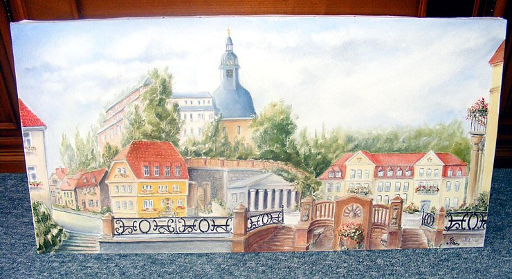 Autor: khhSchaut man in das Wohnzimmer von Eberhard Staps und seiner Frau, so sieht man nur Bilder gerahmt, die er selbst auf die Leinwand mit Pinsel und Farbe gestaltet hat. Die Palette reicht vom sogenannten Stilleben in Öl – und Pastellfarben, über die Landschaftsmalerei, Porträts bis zu Werks –und Städteansichten. Studiert hat er die Malerei nicht. Sein Talent hatte er mit 15 Jahren erkannt als er einen Wettbewerb gewonnen hatte. Die Thüringer Schülerzeitschrift Hilf mit! des Gymnasiums in Lobenstein hatte im Jahre 1942 den Wettbewerb ausgerufen. Er hatten den 1. Preis gewonnen. Das war der Anlass, um sich der Malerei zu widmen. Sein Wissen und Können eignete er sich autodidaktisch an. Das Studium der alten Meister gepaart einem intensiven Studium der Literatur zum Gestalten und zur der Anwendung von Techniken war der Grundstein, um Lobenswertes auf die Leinwand zu bringen.