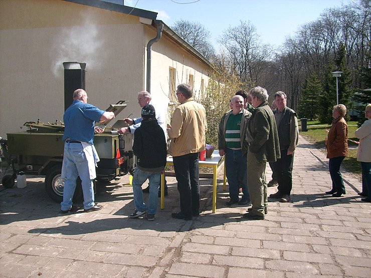 Natürlich wurde beim Familientag Jagd- und Naturschutz auch an das leibliche Wohl der Gäste gedacht. Im Cafe gab es hausgebackenen Kuchen und über die Erbsensuppe aus der Gulaschkanone waren alle voll des Lobes, da viel überhaupt nicht auf, dass das Spanferkel etwas später kam, weil der Verantwortlich kurzfristig zu einer Jagdprüfung Vormittags in Nordhausen antreten musste. Das tat der Sache aber keinen Abbruch.