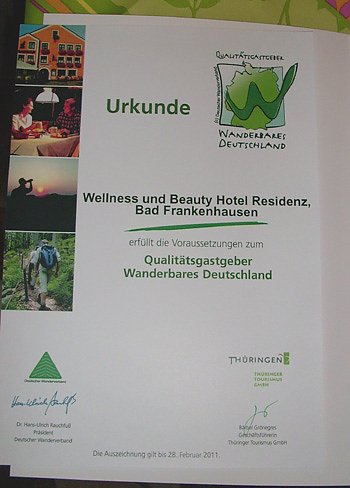 Das Beauty- und Wellnesshotel war im vergangenen Monat erfolgreich zertifiziert worden. Links sehen Sie die Urkunde. Auf der einen Seite ist es von der Prozedur gar nicht mal so schwer den Antrag zu stellen. Der viel schwierigere Teil ist eigentlich die vielen Bedingungen auch zu erfüllen.Wenn bisher die meisten Zertifizierungen im Thüringer Wald vorgenommen wurden, liegt das sicher an einem Punkt, dass eine schöne Landschaft entsprechend vorhanden sein muss, und es auch genügend begehbare Wanderwege in der Region der Unterkunft geben muss. Und da muss man einfach feststellen, dass es bei uns im Norden Thüringens noch genügend Unterkünfte gibt, die sich bewerben könnten.
