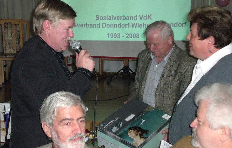 Das alles führte Schatzmeisterin Margot Schüchner mit einem lebendigen Rückblick auf die 15 Jahre vor Augen. Viele Bilder ließen die Erinnerungen aufleben. Möglich geworden war das, weil die Landtagsabgeordnete und Bürgermeisterin von Donndorf Gudrun Holbe (CDU), vom benachbarten VdK-Vorsitzenden aus Roßleben, Wolf-Jürgen Träger, angesprochen, Lottomittel für einen Laptop und Beamer organisierte. Sie übergab nicht nur zu dieser Jubiläumsveranstaltung die Geräte an den VdK-Kreisvorstand, damit er seine Arbeit lebendiger und anschaulicher gestalten kann. Sondern die Geräte kamen mit diesem Vortrag erstmals zum Einsatz. Gudrun Holbe unterstrich, sie freue sich, dass diese Mittel auch gut und zweckmäßig im Verband eingesetzt sind. Kreisvorsitzender Bernd Reiber dankte ihr herzlich für die zweckmäßige Unterstützung, unser Foto.