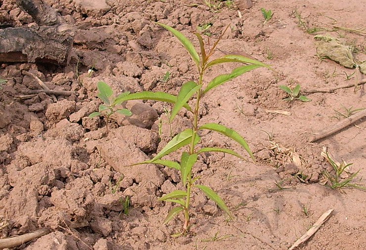 Immer wieder passiert es mal, dass Früchte herunterfallen und unbemerkt liegen bleiben. Da ist es schon oft passiert, dass die Kerne im Herbst mit untergegraben werden. Und siehe da, irgend wann wächst wieder mal ein kleines Pfirsichbäumchen heran. Ob das diesjährige Bäumchen aus einer der sechs vorzeitig heruntergefallenen Früchte stammt, oder aus den Jahren zuvor ist nicht mehr feststellbar. Man kann aber auch nachhelfen. Einfach im Herbst paar Pfirsichkerne auf den Boden werfen und den Boden normal umgraben. Am besten an einer Stelle, die im Frühjahr nicht gleich tief bearbeitet wird. Hier war es zufällig ein Beet, auf dass Buschbohnen gesät werden sollen. Das im Bild gezeigte Pfirsichbäuchen hat im Winter gekeimt und ist jetzt im Frühjahr schon auf gut 15 cm Höhe herangewachsen.