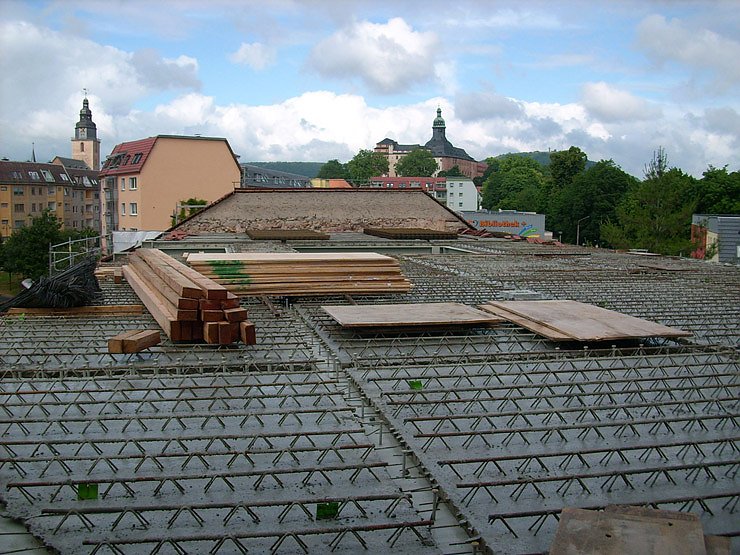 Wie man dem Foto entnehmen kann, ist mit dem diese Woche begonnenen Einzug der Deckenelemente ein wichtiger Schritt getan, so dass es in der Cruciskirche Innen bald trocken zugehen wird.