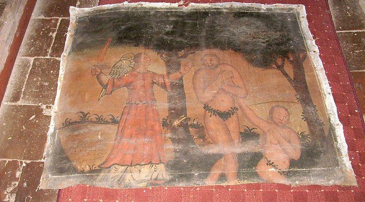 Um dieses Bild geht es bei der Verwendung des Lottobescheides. Es ist ein sogenanntes Emporenbild (Die Vertreibung aus dem Paradies), das restauriert werden muss. Diese Emporenbild ist, genau wie die 44 anderen Bilder der Kirche, etwas ganzbesonderes. Während ähnliche Bild in Bendeleben oder Esperstedt auf Holz gemalt sind, sind die Bilder in Badra auf Leinen gemalt. Bei der Restauration der Bilder wird nur Fehlendes ergänzt. Das heißt, die Bilder werden nicht vollkommend neu gemalt. Als die ersten Bilder von der Restauration zurückkamen, gab es bei einigen Gemeindemitgliedern anfangs lange Gesichter, die ein völlig neues Bild erwartet hatten.