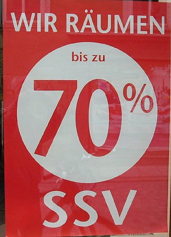 Aber gleich vornweg, die Gefahr des Niedertrampelns bestand zu keinem Zeitpunkt. Kurz nach 09:00 Uhr, die Geschäfte in der Innenstadt hatten gerade geöffnet, wirkt die Stadt Sondershausen wie ausgestorben. Entweder die Schnäppchenjäger sind absolut keine Frühaufsteher, das zahlungskräftige Klientel hat sich lieber in größere Einkaufsstädte verdrückt, oder ist gar in den Urlaub gefahren. Kaum ein Mensch auf der Straße und auch in den Geschäften gähnende Leere. In einem großen Laden nahe Cafe Pille verloren sich gerade mal zwei Einkäufer zwischen den Regalen. Und auch im größten Einkaufszentrum der Stadt, der Schlossgalerie, sah es nicht besser aus, wie Sie sich in der Bildergalerie überzeugen können. Aber selbst die angebotenen 50 bis 70 % Rabatt hatte keine Wirkung gezeigt. Vielleicht hätten sich die Gewerbetreibenden zu mehr Werbung aufraffen sollen, oder ist die Kaufkraft in der Stadt so gesunken, dass nicht mal 70 % Rabatt mehr locken können?