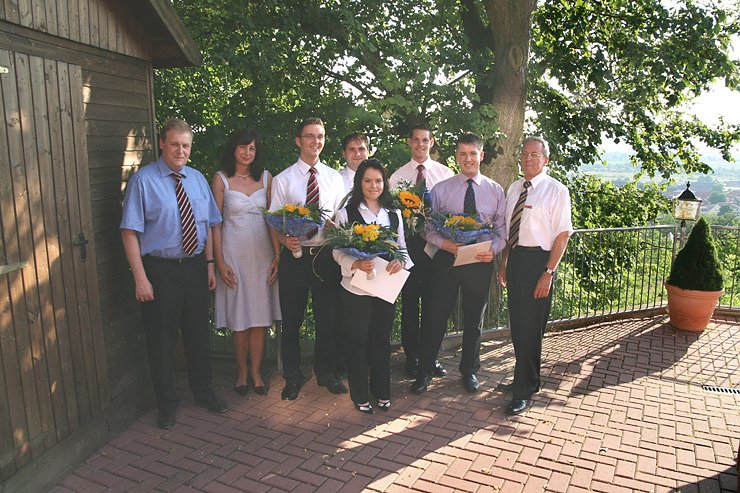 Autor: khhFür Diana Schmidt, Rebecca Krech, Stefan Siering, Sascha Stemme, Tobias Lerdon und Alexander Serwa hat die Lehrzeit nun ein Ende. Alle Sechs haben bei der Kyffhäusersparkasse erfolgreich ihre Ausbildung zu Bankkaufleuten absolviert und die Prüfung der Industrie- und Handelskammer bestanden. Die Zeugnisse wurden im Rahmen einer schon zur Tradition gewordenen feierlichen Veranstaltung bei einem gemütlichen anschließendem Grillabend vom Vorstandsvorsitzenden Karl-Heinz Langhorst (im Bild ganz rechts), Vorstandsmitglied Hans-Joachim Warnecke (im Bild ganz links) und Heike Stegmann, Ausbildungsleiterin, übergeben. Von den sechs ausgelernten jungen Bankern geht einer ab Oktober zum Volkswirtschaftsstudium, die anderen fünf sind inzwischen in das Beschäftigungsverhältnis übernommen worden und arbeiten in verschiedenen Geschäftsstellen und im Bereich Steuerung.
