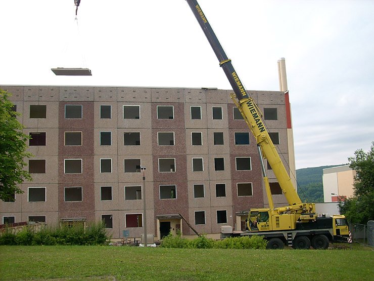 Auch auf den demografischen Wandel zurückzuführen ist dieser Abriss eines Wohnblocks im Östertal. Man kommt schon bald nicht mehr mit dem Zählen hinterher, wie viele Blöcke bereits zurückgebaut wurden, wie das jetzt neudeutsch heißt. Dieses Mal muss man besonders aufpassen, denn der Rückbau erfolgt in einem Block, der unmittelbar neben dem wesentlich niedrigeren Heizhaus steht. Offensichtlich werden hier die Platten lieber einzeln per Kran rausgeholt.