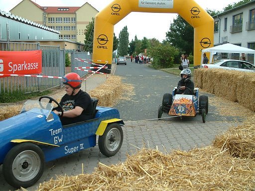 Autor: khhSchon früh um sechs waren die Jugendlichen vom JoinersCorner im Gange. Die Strecke wurde abgesperrt, die Kurven mit Stroh und Reifen präpariert und rund herum Technik installiert damit die Zeitmessung perfekt funktionierte. 25 Fahrer aus 18 Teams sind der Einladung des JoinersCorner-Jugend gefolgt. Um elf war dann alles bereit für die ersten Testläufe. Als tückisch erwies sich der Parcour, da er zwei scharfe 90 Grad Kurve hatte. Im Verlauf des Tages wurden die Strohballen mehrmals zum sicheren Polster für die Fahrer. 13:30Uhr wurde das Seifenkistenrennen durch Frau Günther, in Vertretung für Schirmherr Wolfgang Koenen, und die Arterner Salzprinzessin eröffnet.