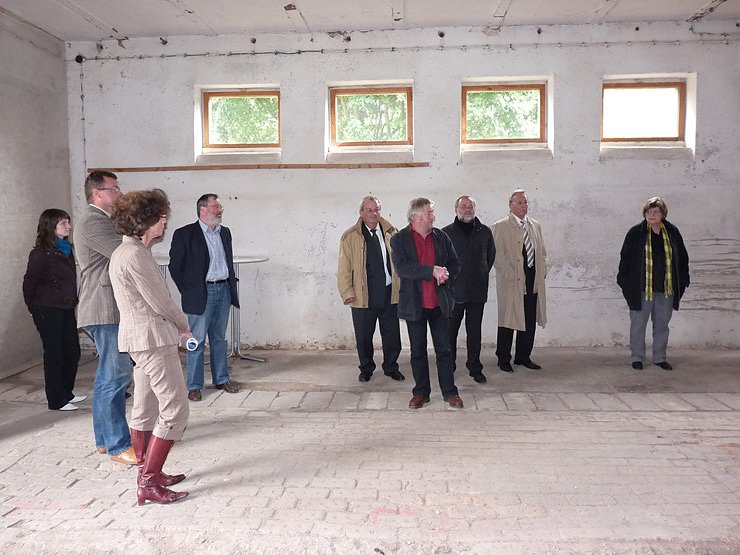 Zuerst stellte Rainer Ende, der Vorsitzende des Kulturland Hainleite e.V. das neue Projekt Kuhstall vor. Aus dem ehemaligen Kuhstall soll ein Mehrzweckgebäude werden. Im vorderen Teil wird die Feuerwehr einziehen. Der hintere Teil wird zu Werkstätten (Grafik) und zu einem Besucherraum mit Bühne umgestaltet. Wobei auch im Besucherraum der Kuhstallcharakter als ein besonders Ambiente erhalten werden soll. Im ersten Stock (unter dem Dach) soll ein Teil als Übernachtungsräume für ca. 30 Personen ausgebaut werden. Landrat Hengstermann sieht gute Chancen, dass das Projekt im Rahmen der Wachstumsinitiative Kyffhäuserkreis gefördert werden kann.