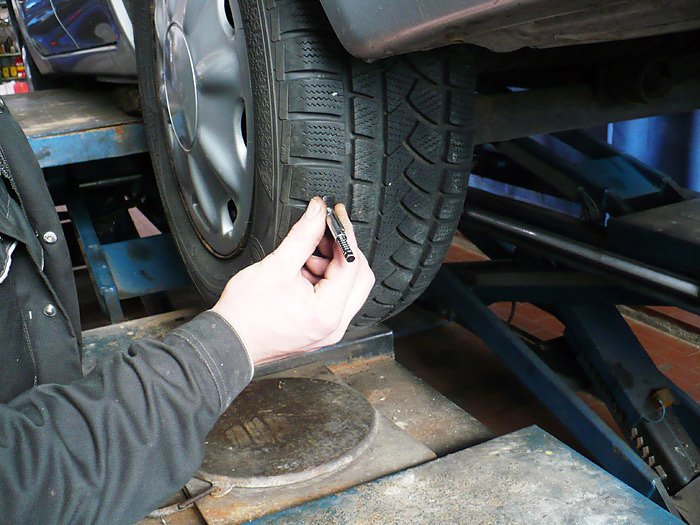 Wintereifenmontage und prüfen der Profiltiefe in der Nissanautowerkstatt Dorl