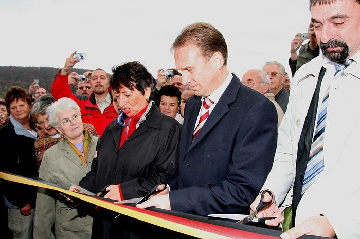 Mit einem Autokorso, angeführt von einem Oldtimer Mercedes mit Ministerpräsident Althaus im Fond, wurde die Ortsumgehung in Betrieb genommen. Natürlich durfte auch eine Feuerwehr nicht fehlen. Bleibt nur zu hoffen, dass die Feuerwehr später nicht mehr zum Einsatz kommen muss. Um ein Haar wäre es bei der Eröffnung zu einem Unfall gekommen, als bei deutlich schlechter werdendem Wetter, eine Windböe einen provisorischen Fahnenmast umriss und zwischen zwei Journalisten einschlug. Bleibt nur zu hoffen, dass es ein gutes Omen war.