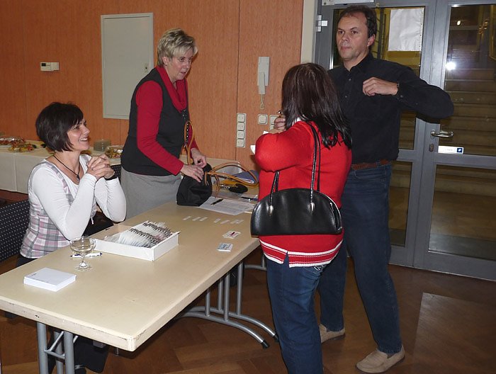 Das Ganze ist natürlich nicht stocktrocken. Schon zur Begrüßung gab es ein Glas Sekt, denn man will sich ja auf unterhaltsame Art kennen lernen. Und wer sich den Mund trocken geredet hatte, konnte mit alkoholfreien Getränken wieder anfeuchten, die wie der Sekt (und später ein kleiner Imbiss) im Unkostenbeitrag von 5 Euro für SGW-Mitglieder und 10 Euro für Nichtmitglieder enthalten war. Mit dem Besuch zeigte sich Susanne Blumenthal sehr zufrieden. Der Abend war nicht annähernd gelaufen und schon 40 Gäste hatten sich eingefunden. Selbst wer etwas später kam, hatte noch ausreichend Gelegenheit, seine Visitenkarten zu tauschen, denn das Zulosen hatte ja nur die Aufgabe die Gespräche schnell in geordneten Bahnen in Gang zu bringen.