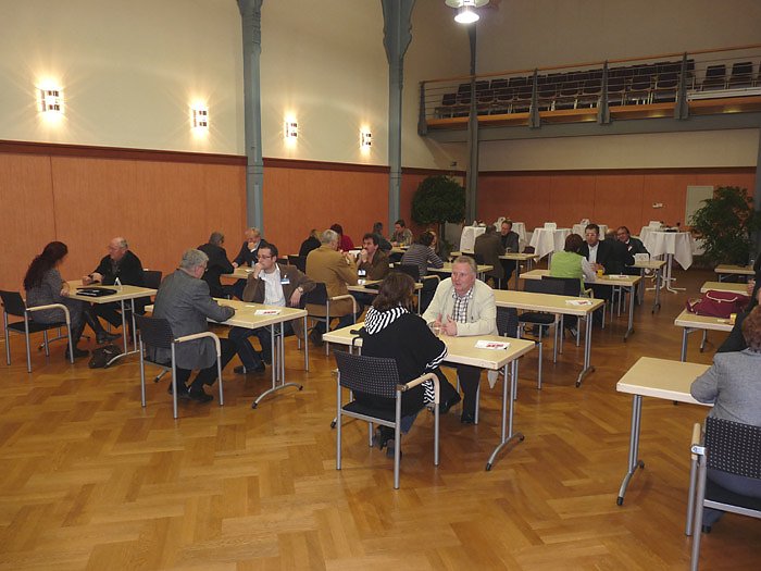 Im Carl-Schroeder-Saal von Sondershausen waren eine ganze Reihe Tische aufgestellt, an den jeweils zwei Interessenten Platz nehmen konnten. Ausgelost wurden Spielrunden, bei denen ermittelt wurde, wer mit wem am Tisch sitzen wird. Im Gegensatz zum Speed dating haben hier die Gesprächspartner ca. 10 Minuten Zeit, um ihr Unternehmen vorzustellen, was man wie in welchem Rahmen vertreibt und wo man eventuell Ansatz für Geschäftskontakte finden kann. Bevor gewechselt wird, kommt natürlich das Wichtigste, der Austausch der Visitenkarten.