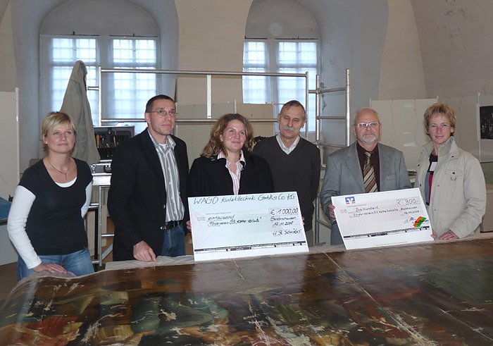 Von der Dierktorin der Käthe-Kollwitz-Schule, Ellen Neumann, sehr gut unterstützt (Organisation von Führungen brachten Geld ein) wurden bisher schon ca. 10.000 Euro gesammelt, auch von einem Spender, der nicht genannt werden will. Heute brachten zwei Sponsoren wieder eine erhebliche Summe auf. Die Firma WAGO Sondershausen, auch bekannt durch seine vorbildliche Berufsausbildung, stellte 1.000 Euro zur Verfügung und von Raiffeisen-Baustoffe Nordhausen kam eine Summe von 300 Euro dazu.