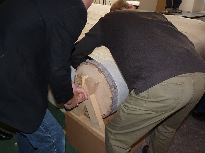 So ein Gemälde kann man nicht einfach falten, sondern muss es vorsichtig auf eine Rolle wickeln, damit es anschließend zur Restauration nach Erfurt kommt.