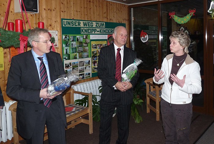 Begrüßt worden war Minister Wucherpfennig, von der Leiterin der Einrichtung Sina Dentel. Vorschulkinder (ca. sechs Jahre) hatten für die Gäste das Lied vom Adventskranz einstudiert und wurden von der Erzieherin Martina Schweder auf der Gitarre begleitet. Im Gespräch mit den Kindern wollte Gerold Wucherpfennig natürlich auch von den Kindern wissen, was sie sich zu Weihnachten wünschen. Wenn das die Eltern (Weihnachtsmann) erfüllen wollen, müssen sie wahrscheinlich gleich auf den Fördertopf zugreifen, denn vom Spielzeugpony bis zum richtigen Pony war alles dabei, was Kinderherzen höher schlagen lässt. Was den Fußballfan Wucherpfennig erfreute, es war auch ein lederner Fußball unter den Geschenkwünschen dabei.