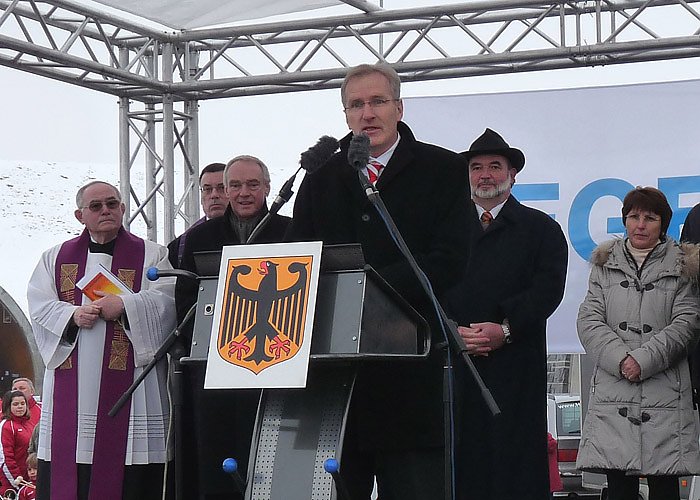 Die Kosten für die Gesamtbaumaßnahme belaufen sich auf 132 Mio. Euro, von denen 85 Mio. Euro für den Tunnelbau verwendet wurden. Nach Baubeginn im August 2005 entstand in 40-monatiger Bauzeit der erste in Deutschland komplett mit weißem LED-Licht ausgestattete Tunnel. Minister Gerold Wucherpfenning (Bild oben)betonte, dass der Tunnel zwar die Kosten sehr nach obern getrieben habe, Dafür aber viel wertvolle Landschaft geschützt werden konnte. Er verwies auch darauf, dass 2009 die Lücke zwischen Tunnel und Sömmerda geschlossen wird. Bei den Bürgern entschuldigte er sich, dass sie die Unannehmlichkeiten der Bauzeit ertragen habe.