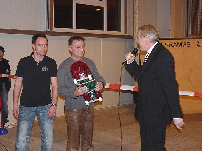 Minister Wucherpfennig war direkt von der Verkehrsministertagung in Berlin (kn berichtete) nach Sondershausen gekommen, um höchstpersönlich der Eröffnung der Sketerhalle bei zu wohnen. Wurden doch von den 828.000 Euro Baukosten immerhin rund 400.000 Euro aus dem Städtebauprogramm Soziale Stadt für den Bau herangezogen. Wucherpfennig bezeichnete das geld als gut angelegt, wird doch hier besonders für die Jugendlichen ein wichtiges Freizeitbetätigungsfeld geschaffen. Zusätzlich übergab Wucherpfennig symbolisch ein Skateboard an Jugendpfleger Uwe Makrinius.