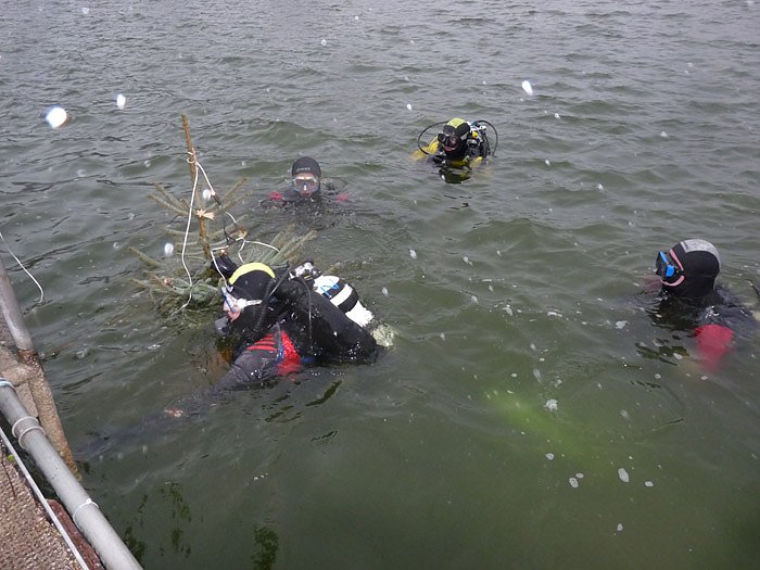 Für die Taucher selbst war das Wetter gar nicht so interessant. Denn nasser als nass kann man im Wasser schließlich nicht werden. Dieses Jahr wurde sogar ein beleuchteter Weihnachtsbaum versenkt. Allerdings konnte man so mit dem Weihnachtsbaum nicht weit raus, denn die Batterie lässt sich nicht so einfach mit ins Wasser nehmen, auch wenn sie die nötige Schwere hat. Bei ca. 5 bis 6 °C Wassertemperatur war das heute für die Taucher im Wasser auch nicht kälter, als für das Publikum an Land. Und auch einige Kinder hatten mit ihren Eltern den Weg ans Wasser gefunden.