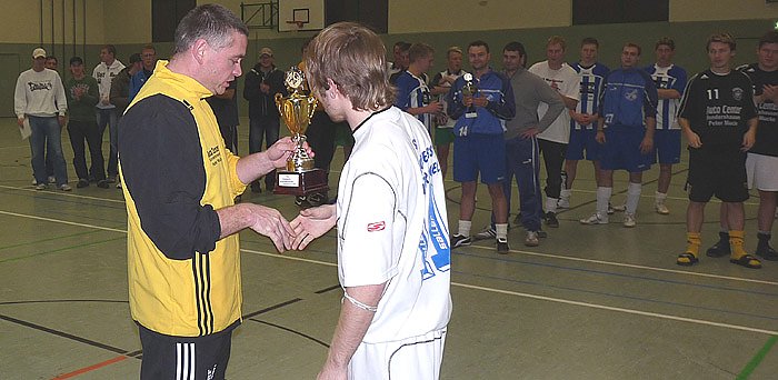 Nachdem Westerengel nach großem Kampf beim Schießen vom Neunmeter-Punkt Greußen niederkämpfte, hatte man im Finale gegen die Eintracht aus Sondershausen keine Chance um kam auch nicht zum verdienten Ehrentreffer. Die Eintracht aus Sondershausen wurde ohne Punktverlust der klare Turniersieger des 1. Sondershäuser- Weihnachts- Championat (Foto oben). Eintracht – Westerengel 5:0. Einen sehr guten 2. Platz hatte sich trotz der Finalniederlage Westerengel gesichert (Bild unten). Auch wenn er die Torschützenkanone knapp verpasste, konnte doch Axel Duft verbuchen, das 100. Tor des Turniers geschossen zu haben.