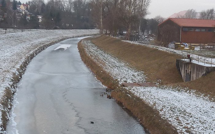 Aber an der Einmündung der Klinge, einem kleinen Bach der vom Hammateich mit gespeist wird, bringt Unruhe in das System. Man kann an obigen Bild recht schön erkennen, dass ab Einmündung der wohl doch recht warmen Klinge gleich eine Hälfte der Wipper wieder eisfrei ist.