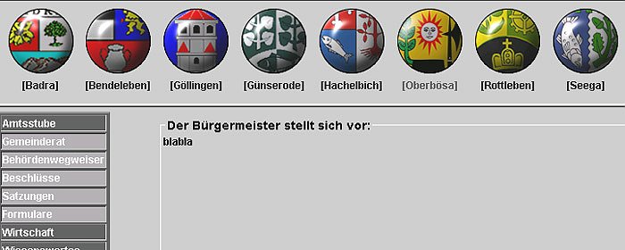 Die Startseite beginnt auch gleich sehr ansprechend und verheißungsvoll. Wer dann auf einen der sehr schön gestalteten Orts-Button drückt wird von der entsprechenden Ortschaft (Verwaltung) mit seiner Seite begrüßt. Der Gruß ist dann allerdings schon etwas knapp gehalten, steht doch da bei allen Gemeinden nur da: Willkommensgruß von Badra (Bendeleben, Göllingen...). Dafür entschädigt wenigstens das zugehörige schöne Ortswappen. Außerdem zeigt sich jetzt die weitere Navigationsleiste.