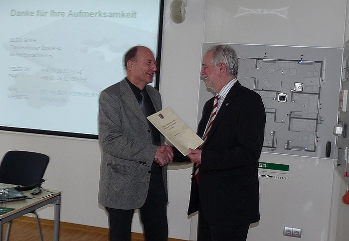 Fertigungsleiter Jürgen Kotsch (li.) erhält den Zuwendungsbescheid von Minister Reinholz.