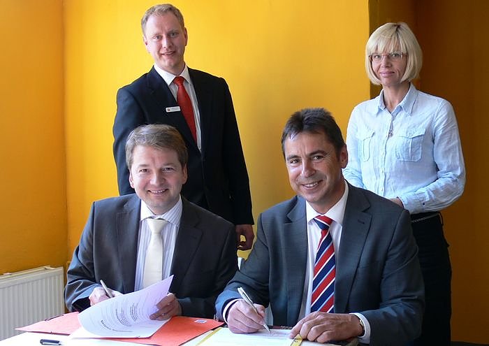 Lars Tietje (vorn links) und Wolfgang Asche (vorn rechts), dahinter Verwaltungsdirektorin der Theater Nordhausen/Loh-Orchester Sondershausen GmbH und Sebastian Gräser, Leiter des Vorstandssekretariates der Kreissparkasse Nordhausen, bei der Vertragsunterzeichnung