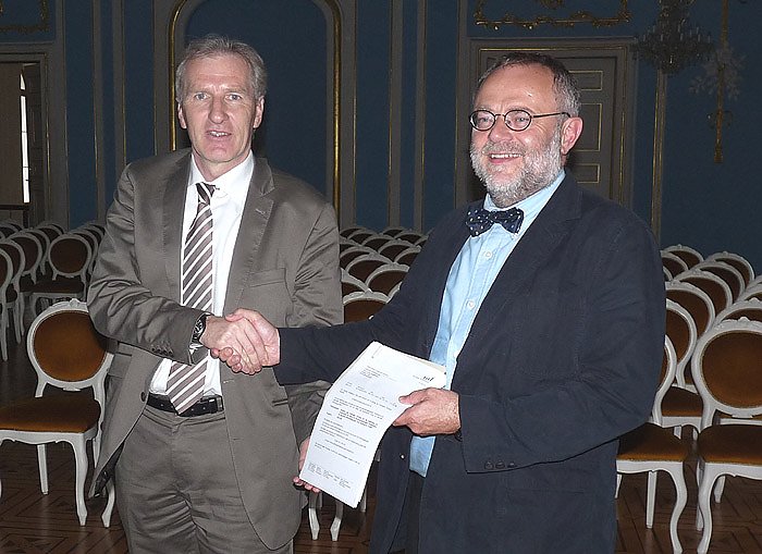 Thüringens Minister für Bau, Landesentwicklung und Medien Gerold Wucherpfennig (CDU) übergab gestern auf Schloss Sondershausen an Landrat Peter Hengstermann (CDU) einen Fördermittelbescheid in Höhe von rund 57.000 Euro übergeben. Mit dem Geld soll der Thüringer Abschnitt des Unstrut-Radweges bis Ende des Jahres durchgehend einheitlich beschildert werden. Landrat Peter Hengstermann hat derzeit turnusgemäß ( für zwei Jahre) den Vorsitz der kommunalen Arbeitsgemeinschaft Unstrut-Radweg inne, dem neben den Landkreisen auch noch 10 Städte und Gemeinden angehören.