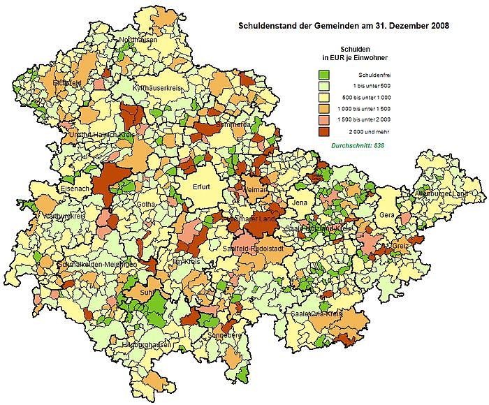 Am 31.12.2008 waren nach Mitteilung des Thüringer Landesamtes für Statistik 130 von 959 Gemeinden (siehe Übersicht) sowie das Landratsamt des Wartburgkreises ohne Schulden gegenüber dem Kreditmarkt und den öffentlichen Haushalten. Allein 33 Gemeinden gehören zum Saale-Holzland-Kreis. Am 31.12.2007 waren 127 der damals 968 Gemeinden schuldenfrei.