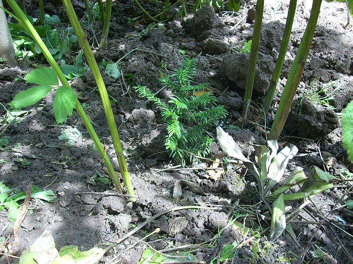 Unter die vielen Unkräuter, Entschuldigung Wildkräuter, hatten sich im Garten auch recht seltsame Pflanzen versteckt, die so etwas aus der üblichen Art schlugen. So zeigte sich zwischen den Brombeeren ein Nadelgehölz, das nie angepflanzt worden war (Bild oben). An Hand der Früchte ist natürlich noch keine Bestimmung drin, aber vielleicht könnte es eine Eibe sein? Nichts genaues weiß der Laie.