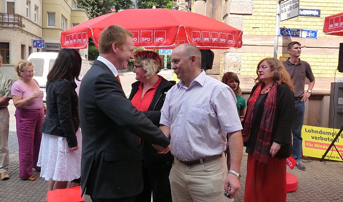 Begrüßt wurde Christoph Matschie vom Kandidaten für den Landtag Dr. Andreas Räuber (Wahlkreis 11). Aber auch die Kandidatin für den Wahlkreis 10, Dorothea Marx und der Kandidat der SPD für den Bundestag, Steffen Lemme, nahmen an der Veranstaltung teil. Die Genossen hatten den Info-Stand auch schon während der Marktzeit ab 09.00 Uhr betrieben.