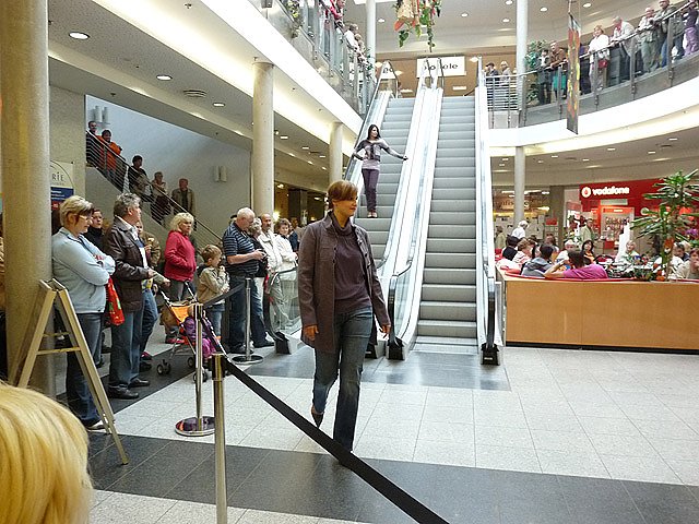 Sehr schön war, wie das Gebäude selbst mit seiner Rolltreppe in die Schau einbezogen wurde. Vorgestellt wurde vor allem Mode, die auch in den Geschäften der Schlossgalerie zu kaufen waren. Kein Wunder also, wenn es genügend Besucher gab.