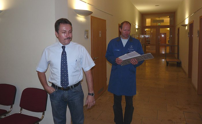 Gute Sachen sprechen sich schnell herum, so dass schon vor der Eröffnung die Stühle im Wartebereich genutzt werden musste, bevor überhaupt die Uhr 08:00 Uhr schlug. Begrüßt wurden die beiden durch Landrat Hengstermann. Das obligatorische Gläschen Sekt bei einer Neueinweihung schlugen die Beiden standhaft aus, weil sie mit dem Fahrzeug da waren. Aber auch die professionellen Kunden ließen nicht lange auf sich warten, wie diese beiden Vertreter des Auto-Hauses Peter aus Sondershausen. War ja letzte Woche doch etwas mühselig, wegen einer Autoanmeldung bis Artern fahren zu müssen.