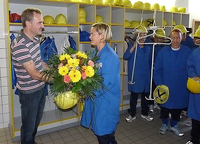 Bevor es uns Bergwerk ging, hieß es sich erst mal richtig auszurüsten. Auch die Damen durften auf den schicken knitterfreien Hut nicht verzichten. Und auch später mussten sie sich, wie alle Besucher, die kurze Belehrung über den Selbstretter anhören. Denn auch bei Prominenten gilt, Sicherheit geht vor.