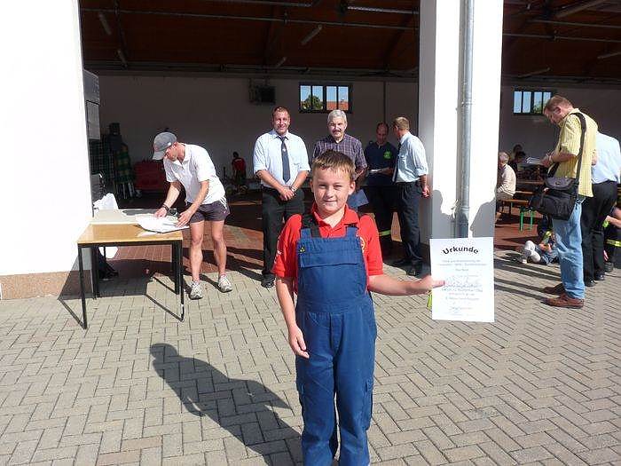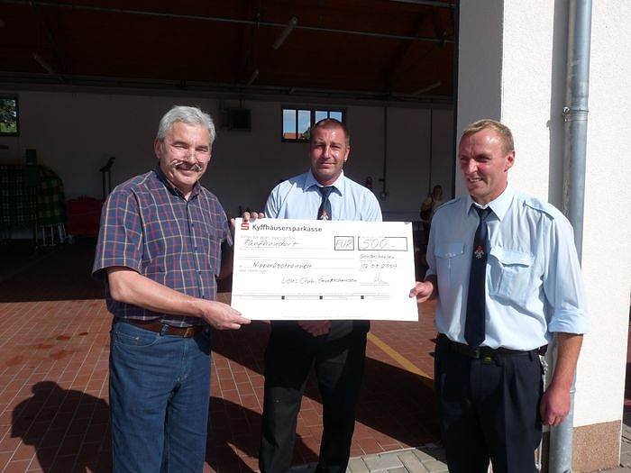 Dr. Stolle über nahm dann auch die ehrenvolle Aufgabe, die Preise zu übergeben, während seine Kollegen vom Lions Club beim Backen der obligatorischen Quarkecken schwitzen mussten. Im Bild oben holt sich ein Mitglied der Feuerwehr –Mitte die Urkunde für die schnellste Mannschaft ab.