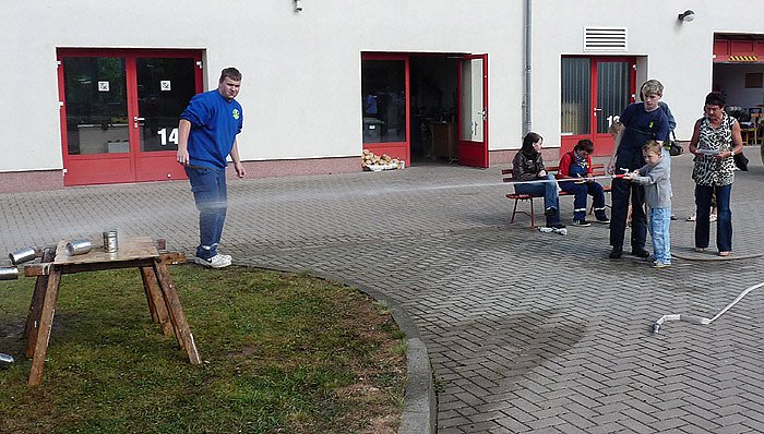 Während sich die Kinder zum Beispiel in Zielübungen mit der Feuerwehrspritze übten, zog es die Erwachsenen mehr zum Stand mit den Bratwürsten und Bier. Aber auch Kaffee und Kuchen fanden viele Abnehmer