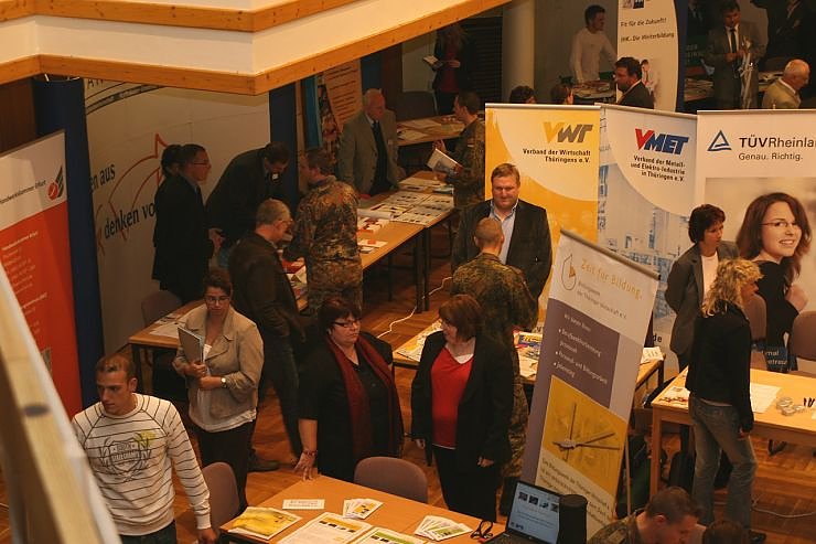 Mit dieser Jobbörse organisierte der Berufsförderungsdienst (BFD) Halle zum vierten Mal zusammen mit dem Zentrum für Nachwuchsgewinnung OST und der regionalen Wirtschaft eine solche Veranstaltung in Thüringen. Ziel war es, den Soldaten, die demnächst aus der Bundeswehr ausscheiden, den regionalen Arbeitsmarkt und den Fachkräftebedarf vorzustellen sowie freie Stellen und Bildungsangebote zu vermitteln.