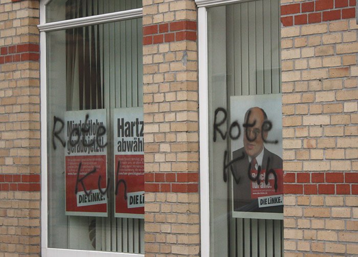 Mit schwarzer Farbe wurde an die großen Schaufenster "Rote Kuh" gesprüht und an der Eingangstür der Schriftzug des Abgeordnetenbüros übersprüht. Vermutlich die gleichen Täter besprühten an der Chausseehaus-Kreuzung das Großplakat Mit Gysi und Lafontaine.