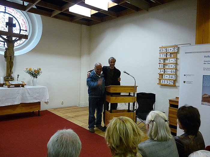 Gestern verabschiedete Thomas Weinrich (Kreisdiakoniestelle) Gorgis Pola, weil er jetzt in die Nähe der niederländischen Grenze zieht, weil er dort Arbeit gefunden hat. Da hat er sich in den letzten Jahren mühsam einen Bekanntenkreis aufgebaut, und muss ihn nun wieder verlassen. Sichtlich bewegt, nahmen gestern beide voneinander Abschied. Der Abschied erfolgte im Rahmen der Eröffnung einer Ausstellung von Deutschen aus Russland in der Trinitatiskirche von Sondershausen.