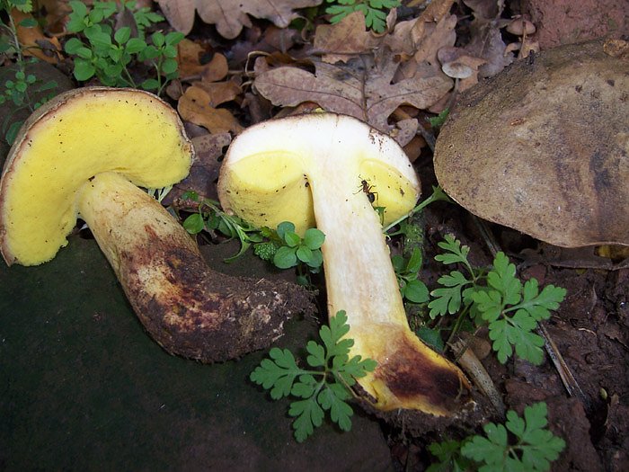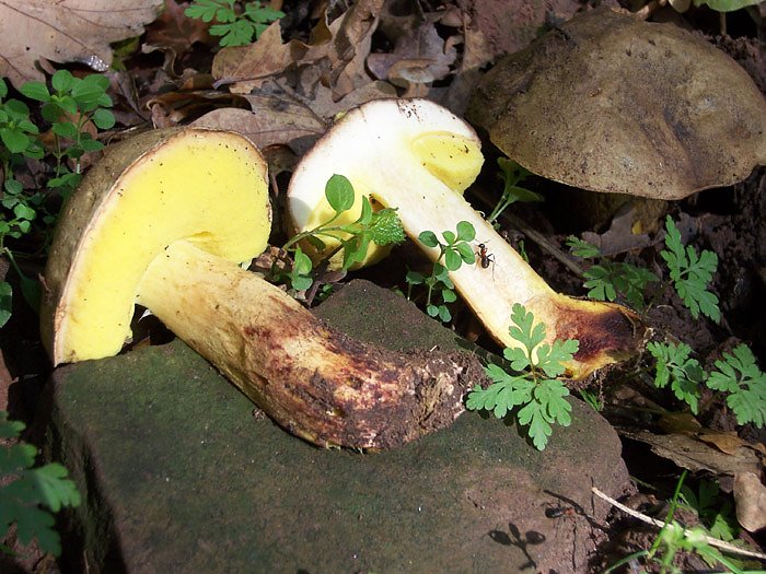 Auch seltene Pilzarten wurden zur Bestimmung mitgebracht, wie beispielsweise der Goldporige Röhrling und der Fahle Röhrling. Beide Pilzarten stehen mit Gefährdungskategorie 2 (stark gefährdet) auf der Roten Liste der gefährdeten Großpilze in Thüringen. Den Fahlen Röhrling (Boletus impolitus) fand R. Süß dann auch selbst am Südhang des Jechaer Dickkopfs in einem Eichenwäldchen. Der Pilz ähnelt einem blassen Steinpilz, allerdings fehlt bei ihm die typische Netzzeichnung auf dem Stiel und die Poren sind beim Fahlen Röhrling leuchtend gelb. Der Stiel ist ebenfalls gelblich, unten auch leicht rot überlaufen und sehr fein bräunlich punktiert. Die Stielbasis ist verjüngt, sogar etwas wurzelnd, und das im Schnitt gelbe, nicht blau verfärbende Fleisch riecht v.a. im Stiel nach Jod oder Apotheke.