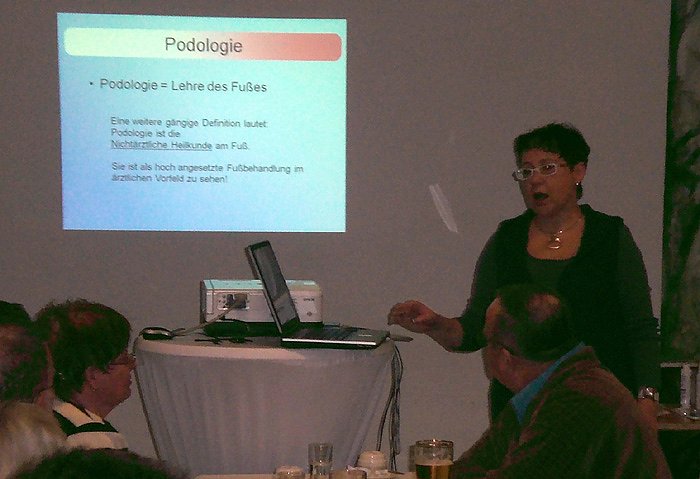 Sie wusste viel Interessantes über die oftmals so vernachlässigten Füße zu berichten und ganz besonders für Diabetiker ist eine richtige Fußpflege wichtig. Aber auch sonst sollte man diese nicht vernachlässigen, erläuterte sie, da hier auch viele andere Beschwerden ihren Anfang nehmen. In einem einstündigen Vortrag, immer wieder auf Fragen der Teilnehmer eingehend, informierte sie über häufige Fußerkrankungen und Beschwerden, ihre richte Behandlung und mögliche Auswirkungen, sprach über Hausmittel ebenso, wie darüber, wann bestimmte fachärztliche Hilfe erforderlich ist, von vorbeugenden Maßnahmen bis hin zu modernen Heilmethoden, von der Zusammenarbeit mit Haus- und Fachärzten bis hin zur Frage, wann die Krankenkassen welche Leistungen übernehmen.